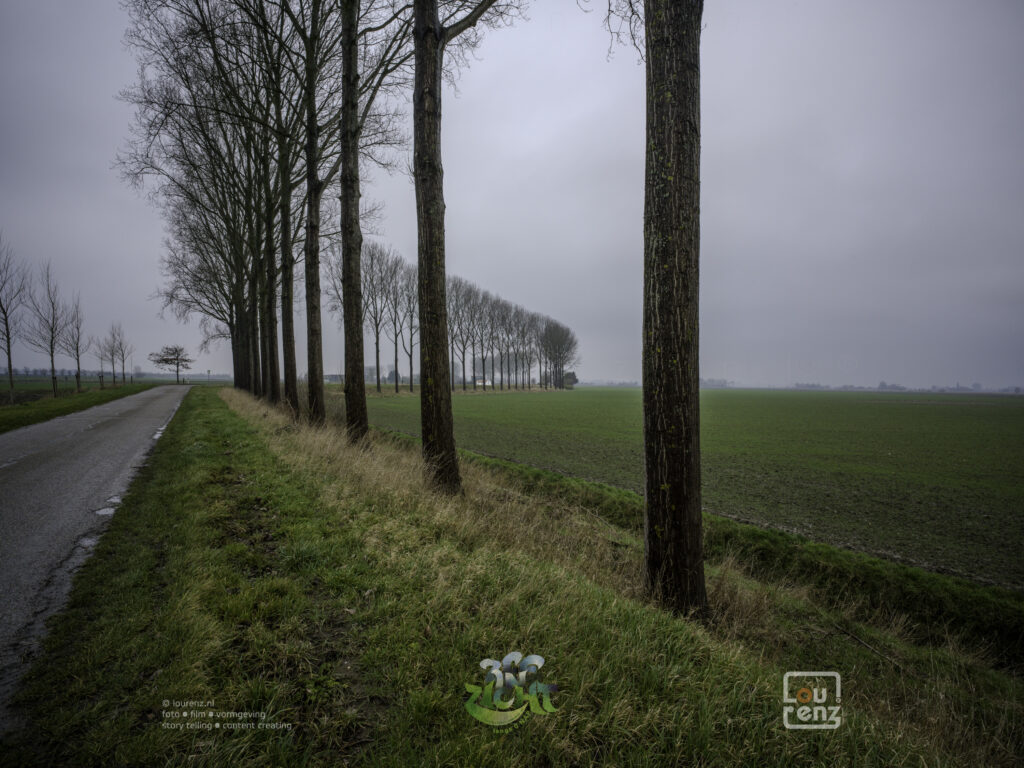 Vlak voor Nummer Eén, zo heet het plaatsje, lijkt me fantastisch om als adres te hebben, ga ik richting zuidwesten. Ik kom langs Wafeldorp, het Gouda van het zuiden?  Het landschap verandert in een oud agrarisch omgeving met lange kronkelende dijken en hoge, statige populieren en korte, stevige wilgen. De dijken lijken mij op een willekeurige manier te zijn aangelegd, maar ze zijn veelal onderdeel van de Saats-Spaanse Linies. Een echte frontzone met linies die op basis van oude middeleeuwse dijken zijn gemaakt. Ik rijd nu voor mijn project ook door niemandsland: geen 0 NAP-lijn en geen kustlijn. Soms moet je pragmatisch zijn: als ik wel via Breskenswas gegaan, dan had ik tot aan Cadzand hetzelfde stuk ook weer terug gefietst. Maar gezien het landschap en historie van strijd tegen het water een geweldige route. Het zal in de zomer ook best mooi zijn, maar die verstilde natuur in de winter is ook om van te genieten. En dan de route-aanwijzingen voor al die lange stukken: ga over 3,7 km rechts af. Het voelt al de hele dag alsof ik het land voor mijzelf heb. Er is bijna geen verkeer.